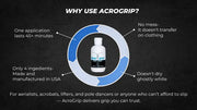 AcroGrip Liquid Chalk is a high-performance grip aid that dries quickly on the skin to create a clean, long-lasting layer of friction. It’s made from a refined blend of magnesium carbonate, rosin, alcohol, and a cosmetic-grade thickening agent, giving you stronger, more reliable grip with less mess than traditional chalk. It works for any sport that needs more grip—calisthenics, weightlifting, rock climbing, gymnastics, pole, aerials, CrossFit, and any sport that needs better grip.