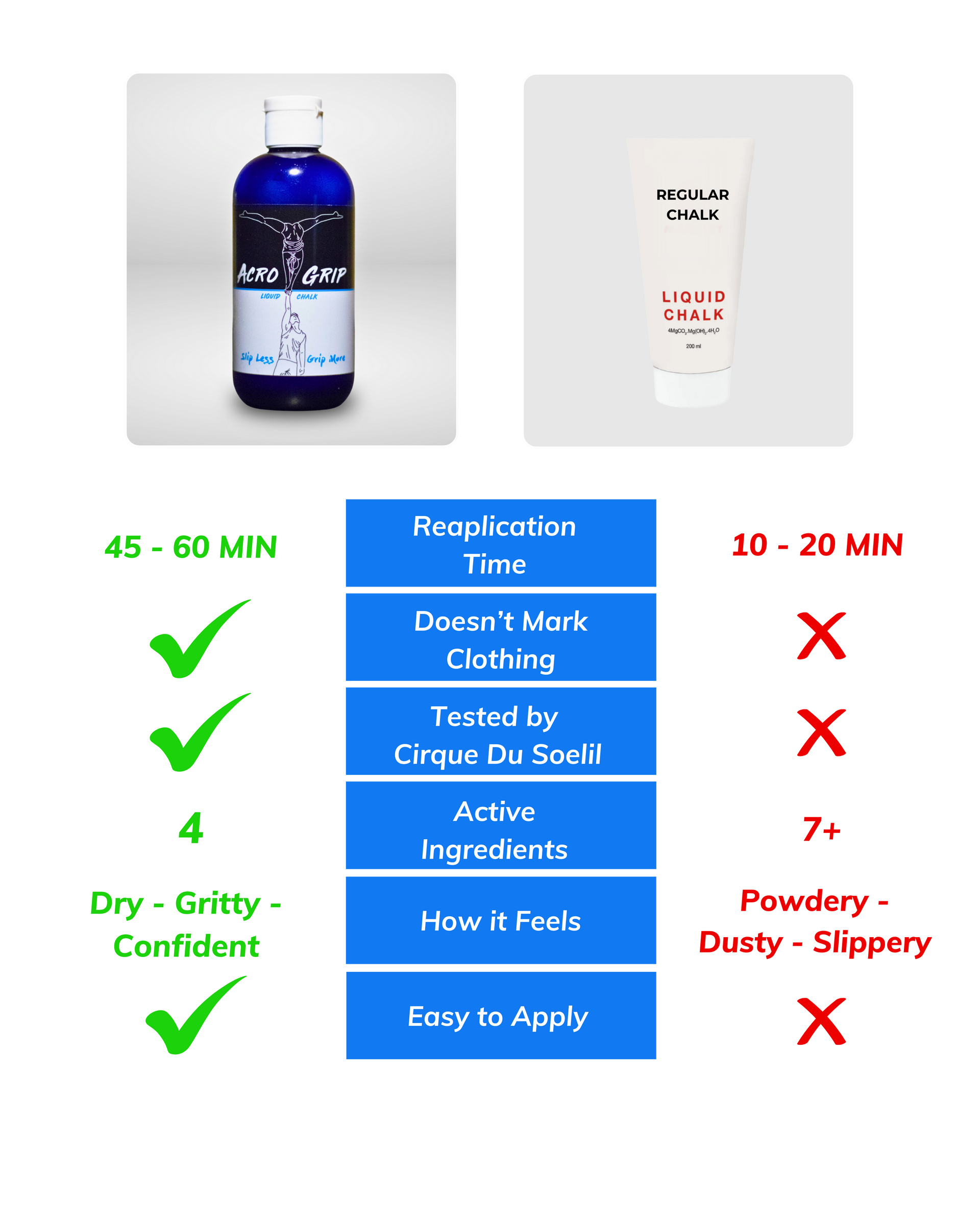 While traditional powdered chalk and most liquid chalks leave a thick, bright white layer on your skin (or worse, all over your clothes and equipment), AcroGrip dries into a clean, subtle finish that doesn’t look chalky or messy.